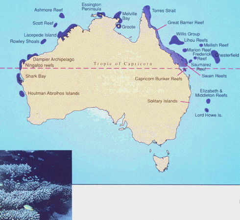 Australia has the largest area of coral reefs (purple) of any nation. (Inset)