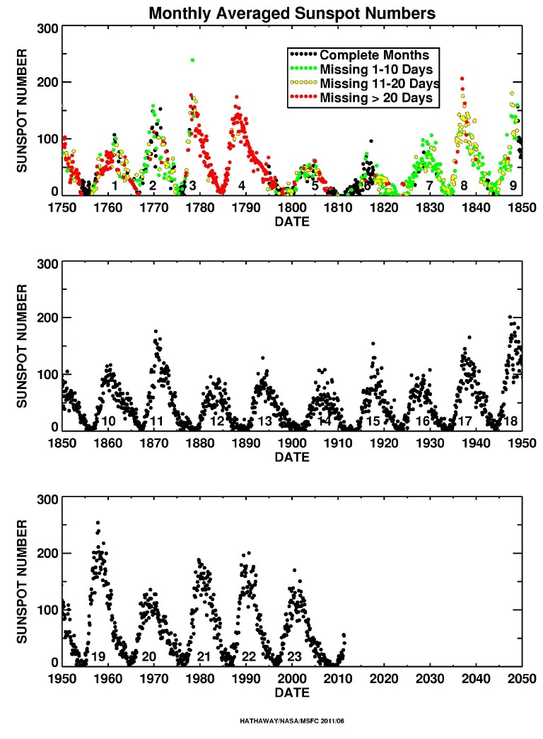 The Sun, a roiling ball of plasma, occupies its place in space approximately 93 million miles from Earth. Though it seems simple to inhabitants of this planet -- the Sun shines, giving light and heat -- the processes occurring in the Sun are so complex that many scientists devote their careers to just one aspect of solar activity. Changes in the activity of the Sun particularly engage solar scientists. Whether fluctuations in the solar magnetic field, expulsions of plasma called coronal mass ejections, emissions of high-energy flares, or changes in the sunspot number, variations in solar activity can be dramatic and therefore highly interesting. Through careful study of solar activity (particularly sunspots, visible from Earth through telescopes) over hundreds of years, scientists have found a consistent cycle of activity: every eleven years, activity rises to a maximum, then falls to a minimum. To track the solar cycle, scientists plot the average of Wolf numbers (values from a method of counting sunspots devised by Johann Rudolf Wolf in 1848) from various observatories daily to get a sunspot number graph. The sunspot or solar cycle does not have the same magnitude every eleven years, however. Entire cycles can have lower activity levels than usual, as during the Maunder Minimum from 1645 to 1700, or the upcoming maximum might have more activity than ever. Sunspots at Solar Maximum and Minimum