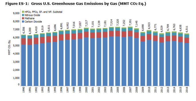 U.S. Greenhouse Gas Emissions In 2016, total gross U.S. greenhouse gas emissions were 6,511.3 million metric tons (MMT) of CO2 Eq.11 Total U.S. emissions have increased by 2.4 percent from 1990 to 2016, and emissions decreased from 2015 to 2016 by 1.9 percent (126.8 MMT CO2 Eq.). The decrease in total greenhouse gas emissions between 2015 and 2016 was driven in large part by a decrease in CO2 emissions from fossil fuel combustion. The decrease in CO2 emissions from fossil fuel combustion was a result of multiple factors, including: (1) substitution from coal to natural gas and other non-fossil energy sources in the electric power sector; and (2) warmer winter conditions in 2016 resulting in a decreased demand for heating fuel in the residential and commercial sectors. Relative to 1990, the baseline for this Inventory, gross emissions in 2016 are higher by 2.4 percent, down from a high of 15.7 percent above 1990 levels in 2007. Overall, net emissions in 2016 were 11.1 percent below 2005 levels as shown in Table ES-2. Figure ES-1 through Figure ES-3 illustrate the overall trends in total U.S. emissions by gas, annual changes, and absolute change since 1990, and Table ES-2 provides a detailed summary of gross U.S. greenhouse gas emissions and sinks for 1990 through 2016. Note, unless otherwise stated, all tables and figures provide total gross emissions, and exclude the greenhouse gas fluxes from the Land Use, Land-Use Change, and Forestry (LULUCF) sector